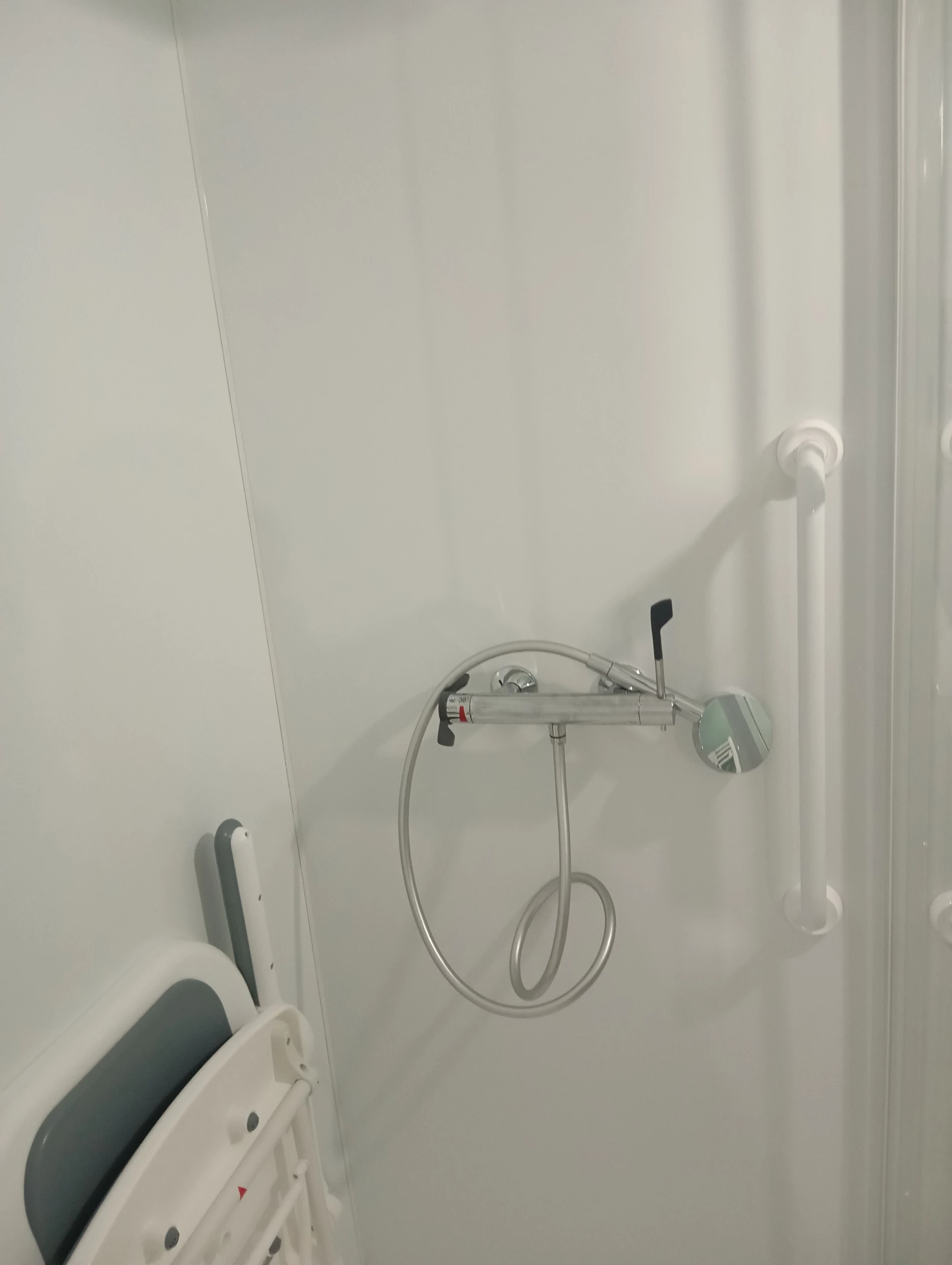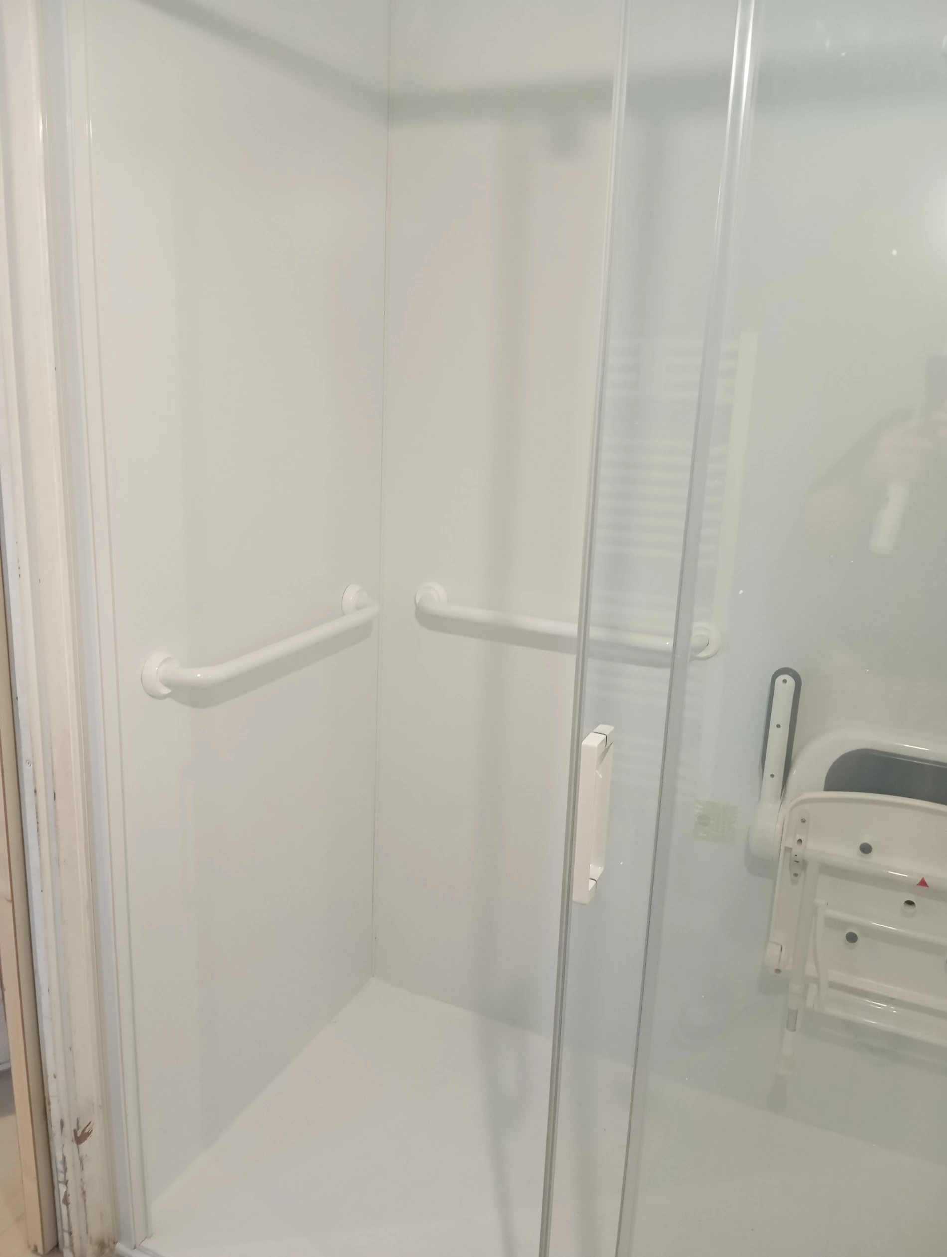 L’aménagement a été complété par la fixation de barres de maintien ergonomiques solidement ancrées dans la structure murale ainsi que par l’installation d’un siège de douche rabattable, offrant confort et stabilité lors de la toilette.